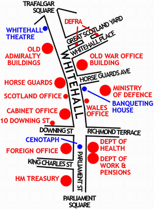 Image: Outline map of Whitehall, London, showing the position of the major UK Government buildings there Image by ChrisO == Licensing == {{GFDL-self}} From en:wiki Category:London