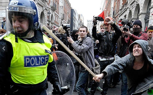 1. And the TUC were complicit in another way. They now appear to be spinning the news to make it appear to the public that all the violence happened _after_ the march. But that’s not true. Look at the blow-by-blow Telegraph reporting stream – the anarchists clearly and repeatedly used the march as “cover”, causing mayhem in the sidestreets and then blending back into the march. The police said as much during the march. Yet the TUC stewards obviously took no action against them at such times, despite their identifiability via all-black clothes and anarchist banners/placards.