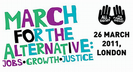 This is a logo for 2011 anti-cuts protest in London.Firstly they are against “cuts”. What alternatives are there for the government? Borrow even more money and throw it away in profligate spending like Gordon Brown did? How much debt do they want to hang round our children’s necks? How much interest do they want us to pay on loans each year (this is already costing about the same as education costs in this country)? The Labour opposition and the protesters have come up with no viable alternative course of government action, because there isn’t one.